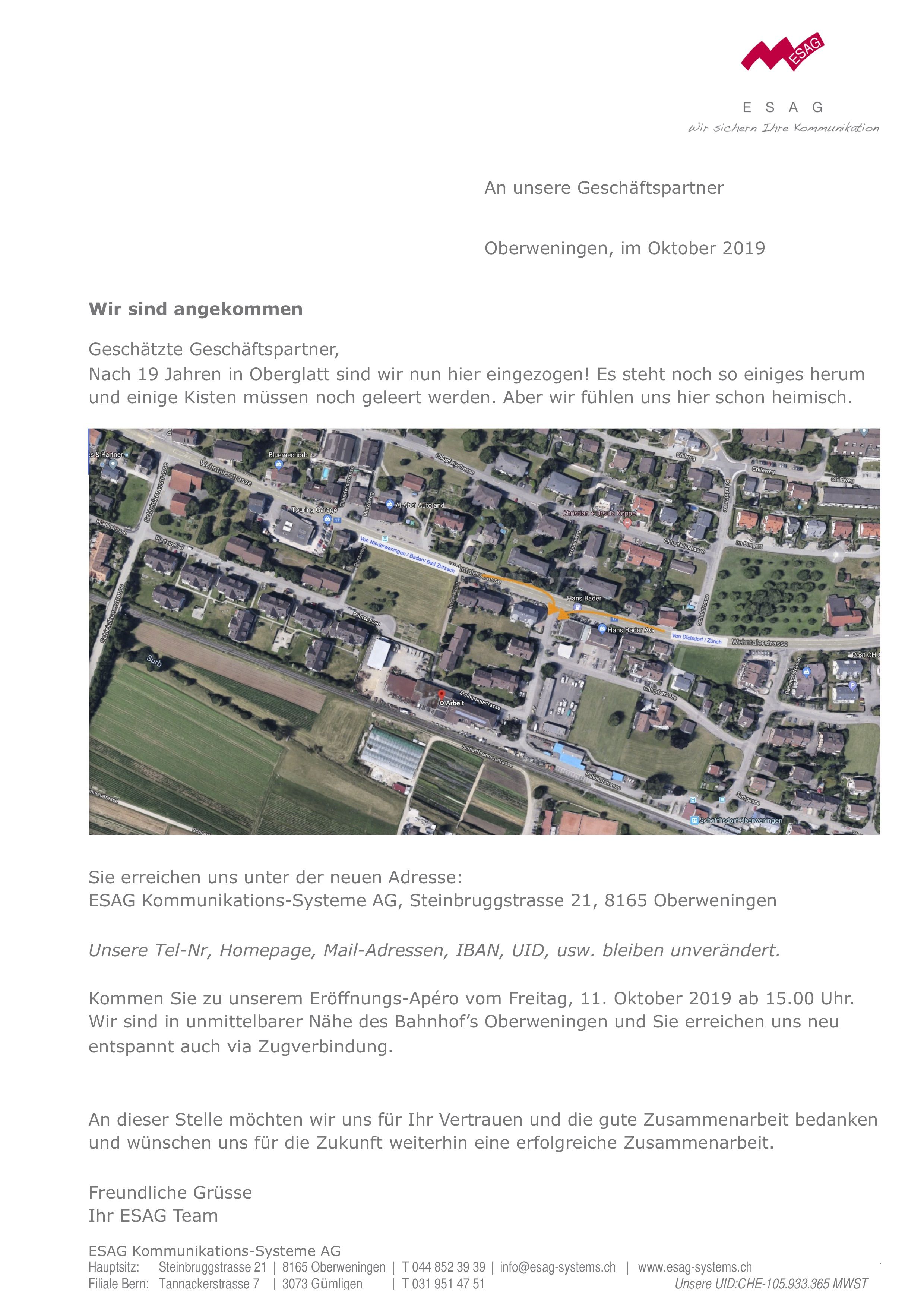 Am Freitag, 11. Oktober 2019 ab 15.00 Uhr feiern wir unseren Umzug an die Steinbruggstrasse 21 in 8165 Oberweningen.