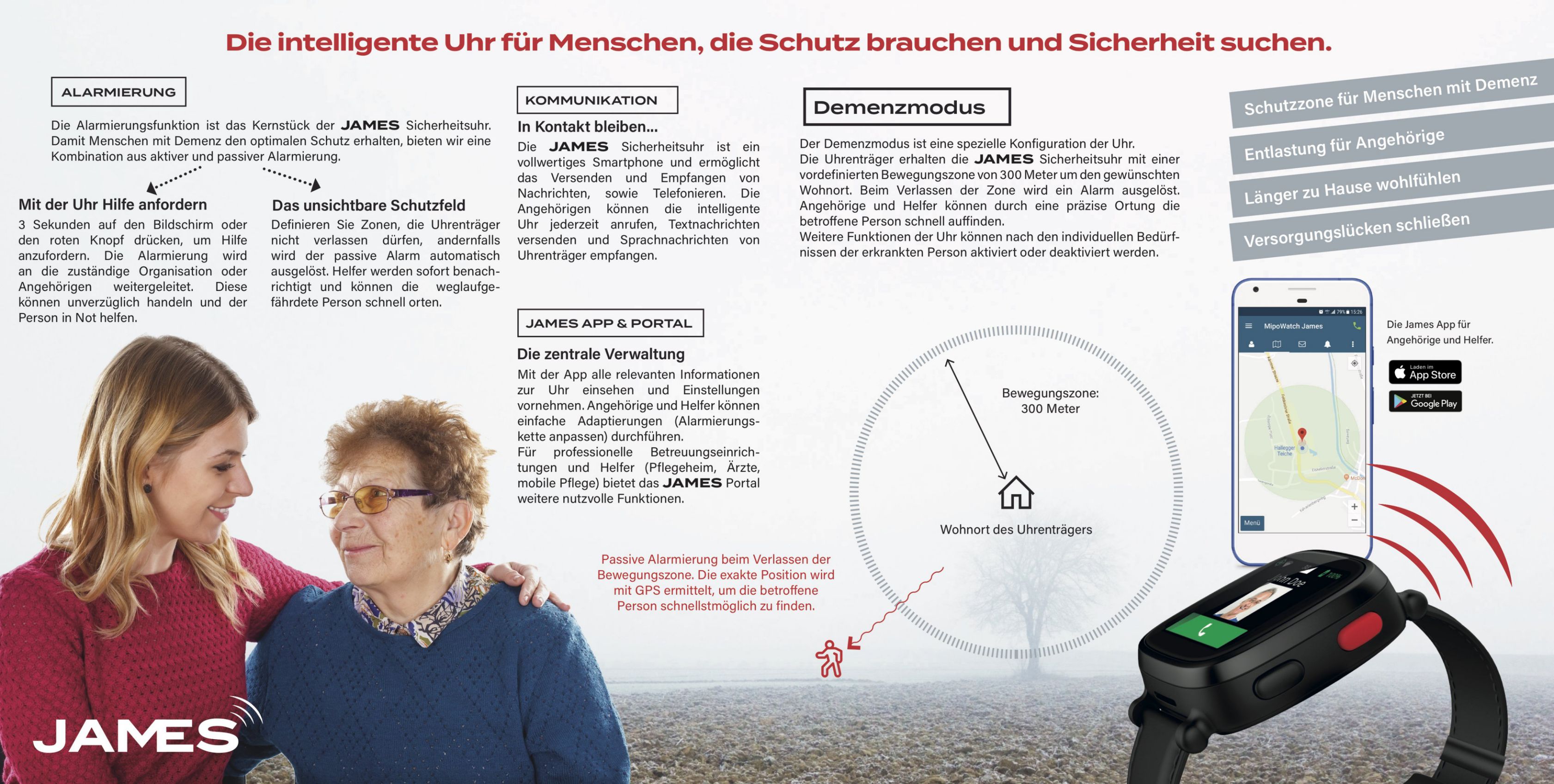 Das JAMES Zusatzpaket STURZ & DEMENZ bietet professionelle Sicherheit für Demenzerkrankte und überzeugt mit einer Vielzahl professioneller Funktionen: Rundumschutz durch aktive und passive Alarmierung, Weglaufschutz, Positionsermittlung, Tür-verlassen-Alarm u.v.m.