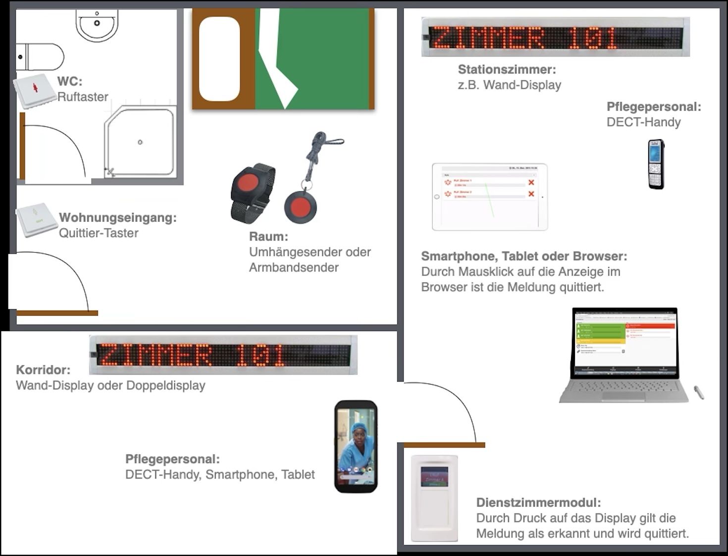 > Sämtliche modernen Informations-Apparate können integriert werden. Smartphone, Tablet, PC, Notebook, DECT-Handy, Pager, Kleindisplay, Korridordisplay, usw.
