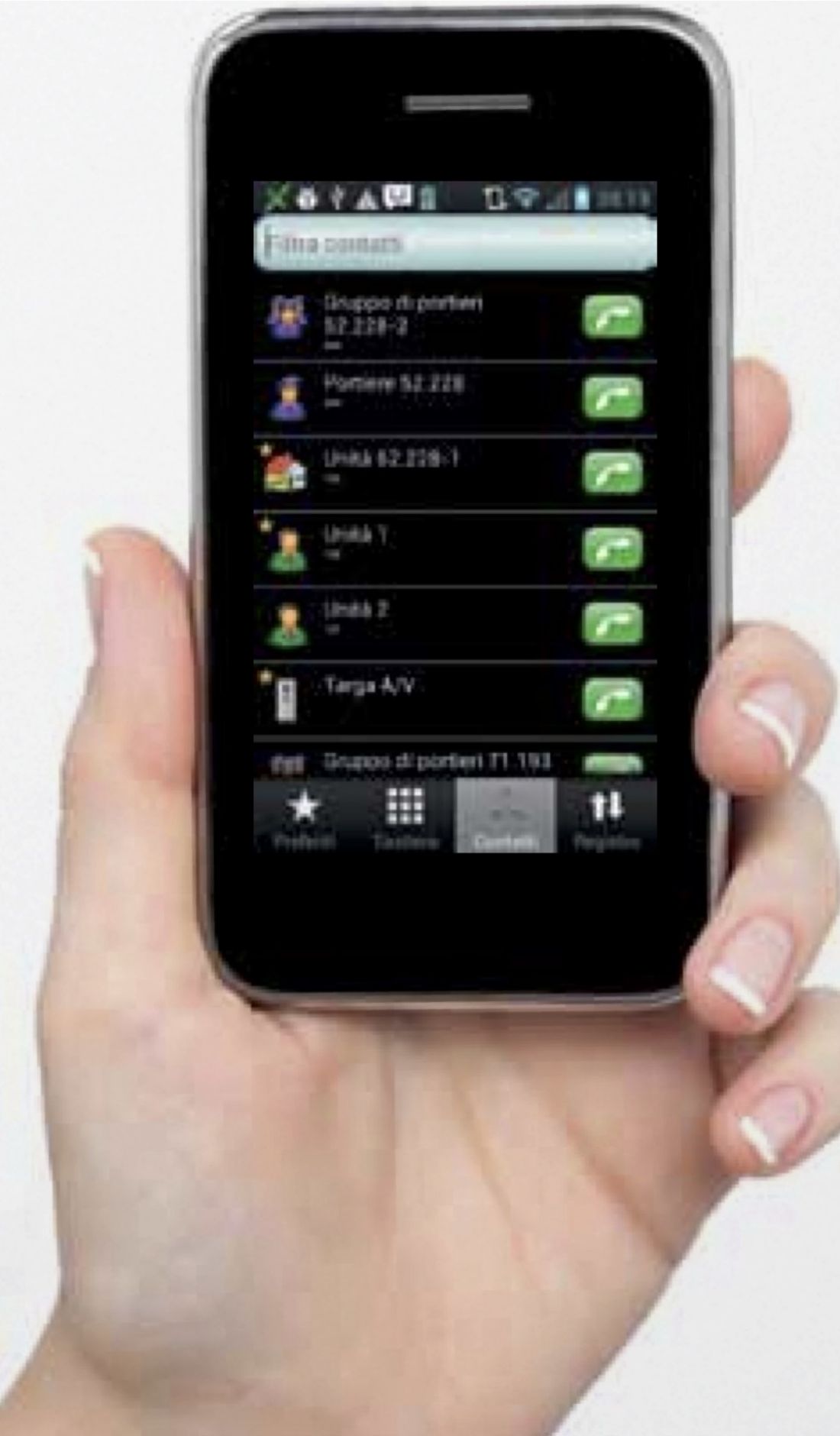 aus der Liste der Eingänge die Türsprechstelle auswählen, die sich automatisch einschalten soll, und die Anruftaste drücken, um das Bild anzuzeigen. das entsprechende Bildsymbol drücken, um die Bilder der Türsprechstelle in der Liste in zyklischer Abfolge anzuzeigen.