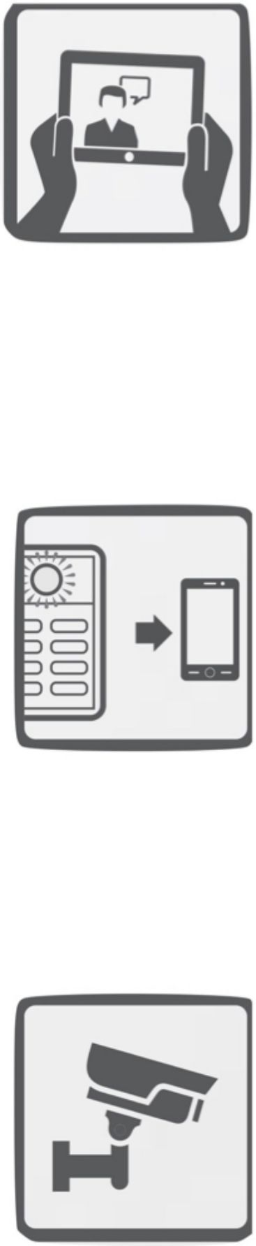 auf dem Bildschirm des Geräts wird eine Videoübertragung von der Aussen- oder Pförtnerstation ausgestattet mit Webcam angezeigt. der Benutzer kann den Ruf ablehnen oder annehmen, indem der Ton zum Anrufenden eingeschaltet wird. Das Video der angerufenen Person kann der rufenden Person angezeigt werden (über das mobile Gerät oder Pförtnerstation) oder über das entsprechende Bildschirmsymbol unterdrückt werden, wenn dies nicht gewünscht ist.